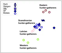 De Scandinavische jagers-verzamelaars werden door Lazaridis et al. (2014) als een aparte voorouderlijke component geïdentificeerd. Een aantal overblijfselen die in Motala, Zweden, werden onderzocht, en een andere groep van 5000 jaar oude jagers-verzamelaars van de Pitted-warecultuur, werden geïdentificeerd als behorend tot de SHG. De studie stelde vast dat een SHG-individu uit Motala (Motala12) succesvol kon worden gemodelleerd als zijnde van ca. 81% westelijke jagers-verzamelaarsafkomst en ca. 19% oud-Noord-Euraziatische afkomst (ancient North Eurasian, ANE).