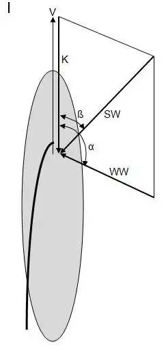 - = invalshoek schijnbare wind met scheepskoers in graden