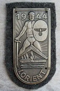 Lorientschild | Onofficiële, lokaal vervaardigde schild | Beleg van Lorient, 1944–1945[18] | ca. 10.000-12.000[19] | Heer, Luftwaffe, Kriegsmarine |