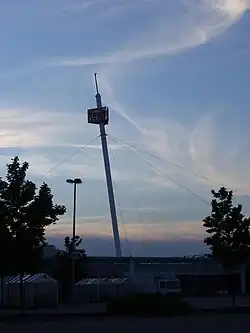 Bij de ingang verrijst een gekantelde mast met het logo van het Schwarzwald-Baar-Center, voorzien van een vliegveiligheidslamp.