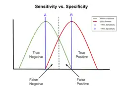 Een test kan een hoge sensitiviteit (gevoeligheid) hebben, maar vaak vals alarm slaan. De test moet ook specifiek zijn, dat wil zeggen zo veel mogelijk positieve uitslag geven bij de door de test onderzochte ziekte, en zo weinig mogelijk bij afwezigheid van de geteste ziekte. Een ideale test zou een sensitiviteit van 100% moeten hebben (bij alle ziektegevallen is de test positief) en ook een specificiteit van 100% (als de ziekte afwezig is, is de test negatief). Deze 100% accurate test is de gouden standaard.[1] In werkelijkheid is dit nooit het geval, of is zo'n test niet praktisch of te duur.