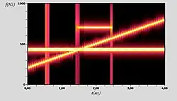 Hoewel de resolutie kleiner is dan het verschil tussen de twee vaste sinussen zijn ze toch niet van elkaar te onderscheiden wegens de leakage van het gebruikte Hanningvenster. De sweepsinus verloopt trapsgewijs door het steeds opschuivende venster. De tijdelijke sinus van 700 Hz is duidelijk zichtbaar. Bij de start en het einde van deze sinus treden telkens frequenties op verschillend van 700 Hz. Dit komt doordat in het eerste venster dat de sinus bevat, de sinus niet over de volledige lengte van het venster loopt. Het begin van de sinus valt immers niet samen met de rand van een positie van het venster Hetzelfde gebeurt bij het laatste venster: ook dat bevat de sinus van 700 Hz slechts in een deel van het venster. De fouriertransformatie moet dus in deze gevallen niet alleen de sinus reproduceren, maar ook rekening houden met het feit dat de sinus in een deel van het venster afwezig is. De Diracpuls op 0,59 seconde is ook zichtbaar in twee vensters, aangezien de opeenvolgende vensters elkaar met 50% overlappen. De exacte positie is dus moeilijk te kennen, want dit zou een kort tijdvenster vereisen waardoor de frequentieresolutie evenredig zou toenemen. De wavelettransformatie kan dit probleem wel oplossen omdat ze op lage frequentie een goede frequentieresolutie biedt, en op hoge frequentie (waar de Diracpuls nog steeds zichtbaar is) een goede tijdresolutie.