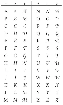 Er werden speciale ligaturen gemaakt, zoals voor de 'Q' met een sierstaart rechtsonder, waarnaast een kleine letter 'u' op één loodblokje stond. Zo ook voor de kleine letter 'g' met een staart aan de linkerkant, waarbij voorafgaande tekens boven de staart gecombineerd moesten worden.