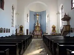 Het interieur van de kerk is eenvoudig. Naast de laatbarokke zijaltaren, die de heilige Anna (links) en de heilige Franciscus Xaverius (rechts) tonen en de classicistische kansel is vooral het hoogaltaar noemenswaardig. Het werd door een kunstenaar uit de omgeving van Paul Egell gebouwd en bestaat uit een zich boven het tabernakel verheffend kruisbeeld. Aan de voet van het kruisbeeld staat de heilige Rochus, de beschermheilige van pestlijders, die zich hier als voorspreker van de zieken tot de Gekruisigde wendt. Tegenover de heilige Rochus bevindt zich een biddende engel.