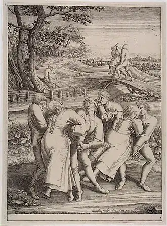 - ↑ Opschrift: VERTOONINGE Hoe de Pelgerimmen, op S. Ians-dagh, buyten Bruffel, tot Meulebeeck danffen moeten; ende als fy over defe Brugh gedanft hebben, ofte gedwongen werden op defe volgende maniere, danfe fchijnen fy, voor een Iaer, van de vallende Sieckte, genefen te zijn. Vooraen gaen defe Speel-lieden ofte Moefelaers, fpeelende op Sack-pijpen; daer nac volgende Pelgrims, die met ftercke Huyslieden gevat worden, feer ongaerne tegen baren wil [gelijck in de tweede ende derde volghende Figuere vertoont wert] fom krijtende en roepende; maer komende ontrent de Brugge, foo keeren fe haerom, ende gebruycken groot tegenweer; maer gevat zijnde, werden over de Brugge geheft ende gedragen; over zijnde fitten neder als vermoeyt wefende: ende dan komen de Huyslieden van dier plaets, haer lavende, ende wat warms in-gevende: ende isfoo dit werek vol-eyndt. Seer aerdigh uyt-gebeeldt door den uytnemenden konstigen schilder Pieter Breugel, gesneden ende gedruckt ten huyse van Henricus Hondius in ’s Graven-Hage 1642.
