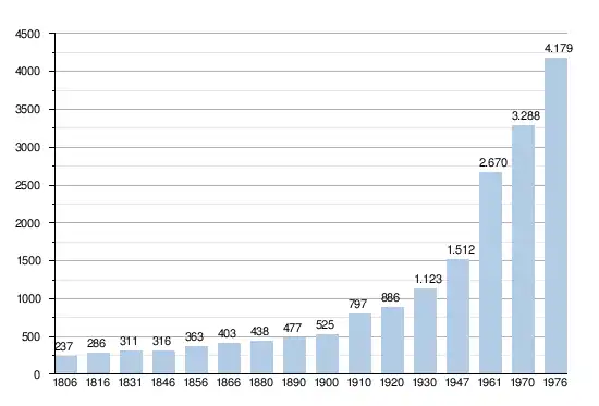 - Bronnen:NIS, Opm:1806 tot en met 1970=volkstellingen; 1976 = inwoneraantal op 31 december