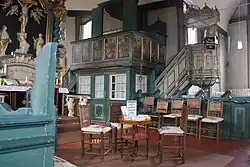 De beeldenrijke kansel uit 1599 vertegenwoordigt de plattelandsbarok. Aan de kanselvoet bevindt zich het beeld van Mozes die het Oude Verbond symboliseert, waarop het Nieuwe Verbond wordt gebouwd. De kanselkuip wordt versierd met de reliëfs van Christus, de evangelisten en de apostel Paulus. Het klankbord is gedecoreerd met vijf portretten van vroegere predikanten van de kerk.