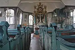 Opvallend in de kerkruimte zijn de 55 kunstzinnig vormgegeven smeedijzeren hoedenstandaards van de voormalige mannenbanken, die ook in andere kerken van de streek te zien zijn. De banken uit 1803 hebben nog veel oude naambordjes en kastjes voor de gezangenboekjes met resten van geschilderde en houtgesneden versieringen uit de 17e en 18e eeuw. De overheersende blauwe kleur dateert eveneens uit 1803.