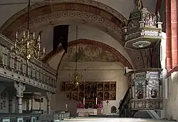 Het romaans-gotische kerkgebouw bezit een barokke kansel, een classicistisch orgel en een kostbaar gotische vleugelaltaar. De galerijen werden vanaf 1662 ingebouwd en in 1745 door de leraar Dierk Krüger uit Elmendorf beschilderd. De panelen zijn in originele staat bewaard gebleven en tonen scènes uit het Oude en Nieuwe Testament. Deels zijn de gebeurtenissen boven de schilderijen aangegeven; er onder staan de namen van de personen die de panelen financierden en op de galerij hun plaats hadden.