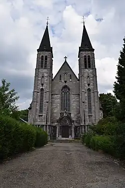 De voorgevel is gebaseerd op die van de Abdij van Maredsous en is uitgevoerd in blauwe hardsteen. De voorgevel heeft een portaal met timpaan en daarboven een hoog spitsboogvenster. Deze gevel wordt geflankeerd door tweelingtorens van elk vier geledingen.