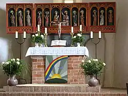 Het in de middeleeuwen gemetselde altaar heeft een retabel met houten beelden die op basis van stijlkenmerken in het derde kwart van de 15e eeuw worden gerangschikt. Op het altaar staan twee paren kandelaren, waarvan het oudste paar uit de late gotiek van rond 1500 dateert. Het jongere paar kandelaren zijn barok en werden in 1680 door Janes Petersen geschonken. Tussen de kandelaren staat een laatgotische crucifix uit het einde van de 15e eeuw.