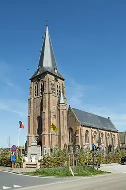 In de 15e eeuw werd hier een laatgotische hallenkerk gebouwd, welke in 1903 werd uitgebreid en van een doopkapel voorzien door Jules Carette. Tijdens de Eerste Wereldoorlog werd de kerk verwoest. Wederopbouw naar aanzien van de verdwenen kerk volgde in 1923 onder leiding van Marcel Hocepied. De kerk werd enigszins vergroot en de neogotische elementen die in 1903 waren aangebracht, werden nu weggelaten.
