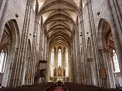 Het beeldenrijke portaal toont de heiligen van de kerk en een voorstelling van de Kroning van Maria. De kleurrijke vensters, vooral het roosvenster in de westelijke gevel, laten het bontzandsteen in wisselend licht schijnen.