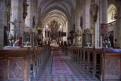 Het kerkmeubilair is voornamelijk barok en dateert uit het einde van de 17e eeuw en het eerste kwart van de 18e eeuw. Het hoofdaltaar met de beelden van de evangelisten en de heilige apostelen Petrus en Paulus bezit een schilderij van de verheerlijking van Martinus van Felix Anton Scheffler. De barokke zijaltaren van Maria-Tenhemelopneming en de Heilige Familie met schilderijen uit het atelier van de Silezische Rembrandt Michael Leopold Lukas Willmann stammen uit de late 17e eeuw. Aan Willmann zelf worden de beide bovenste schilderwerken toegeschreven: Maria opgewacht door de Heilige Drie-eenheid en de mystieke kus van Maria. Tegenover de preekstoel staat een rococo-altaar met de voorstelling van de dood van de heilige Johannes van Nepomuk uit de jaren 30 van de 18e eeuw en in de Mariakapel een barok altaar met een gotisch beeld van een Madonna met Kind uit de 15e eeuw.