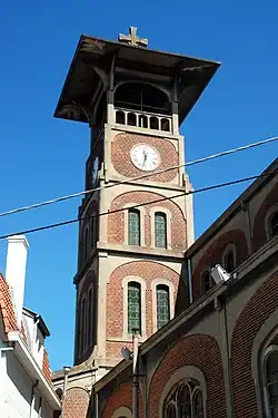 Aan de westkant heeft de kerk een vreemde klokkentoren van vijf geledingen. De derde verdieping draagt de uurwerken, terwijl de vierde verdieping de klokken herbergt onder een brede dakoversteek. Daarop bevindt zich een groot betonnen kruis.