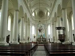 De kerk heeft een basilicaal driebeukig middenschip bestaande uit zeven traveeën. Het priesterkoor bevat een quasi halfronde apsis. Het schip van de kerk is 39 meter lang en 21 meter breed. Het koor is 11 meter lang en 10 meter breed. De middenbeuk heeft twaalf Toscaanse zuilen die de twaalf apostelen voorstellen.