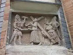 Boven de zuidelijke ingang van de kerk is nog een zandstenen reliëf ingemetseld van Sint-Vitus in de olieketel. Het reliëf zou dateren uit de tijd van de inwijding van de kerk (1168).