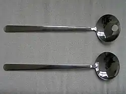 Bij het opscheppen is het gebruikelijk om de lepel onder te houden. Op die manier kan de dressing mee worden opgeschept.