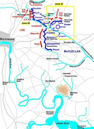 McClellan was erin geslaagd om Richmond tot op enkele kilometers te naderen. Na de Slag bij Seven Pines ontstond er een patstelling. Lee was ervan overtuigd dat hij een Noordelijke belegering niet kon weerstaan, daarom reorganiseerde en versterkte hij zijn leger om zelf in het offensief te gaan. Lee zou McClellans rechterflank aanvallen met 60.000 soldaten waaronder Jacksons divisies.[3] De Zuidelijke cavalerie onder generaal-majoor J.E.B. Stuart had via verregaande verkenning kunnen vaststellen dat dit inderdaad een zwak punt was.