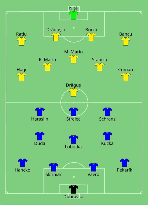 Slowakije speelde op 26 juni 2024 in Frankfurt am Main tegen Roemenië zijn laatste groepswedstrijd. In de eerste minuut werd een schot van Andrei Rațiu gekeerd door Dúbravka, waarna Ianis Hagi in de rebound over het doel schoot. Ondrej Duda kopte de Slowaken in de 24ste minuut op een voorsprong uit een voorzet van Juraj Kucka. In de 34ste minuut bracht Hancko Hagi ten val, waarna Răzvan Marin vanaf de penaltystip de gelijkmaker maakte. In het vervolg van de wedstrijd moesten beide doelmannen in actie komen, maar werd er niet gescoord. Slowakije kwalificeerde zich door het 1–1 gelijke spel met vier punten als een van de beste nummers 3 voor de knock-outfase.[8]