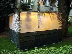 De hut wordt geplaatst onder de blote hemel zoals aan een serre, op het balkon, in de tuin, op een binnenplaats of op het platte dak van het huis. Het dak is niet van hout maar wordt afgedekt met takken of loof, vandaar ook de term loofhut. Het is namelijk essentieel dat door de dakbedekking heen de lucht en 's avonds de sterren zichtbaar zijn, dit als symbool van de overgave aan de goddelijke bescherming.[1]