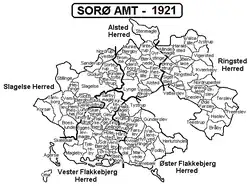 Sorø was verdeeld in vijf herreder. Daarnaast lagen de steden Ringsted, Sorø, Skælskør, Korsør en Slagelse binnen het amt.