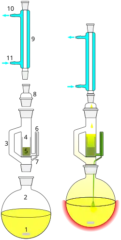 Eenmaal terug in het onderste reservoir gaat bij het koken alleen het oplosmiddel weer in dampvorm over. De opgeloste stoffen verzamelen zich daarom geleidelijk in het onderste vat. Op deze manier is het mogelijk om met weinig oplosmiddel toch een nagenoeg volledige extractie uit te voeren.