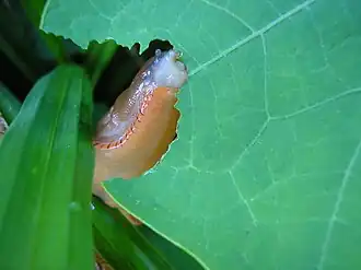 Een Spaanse wegslak, etend aan een blad