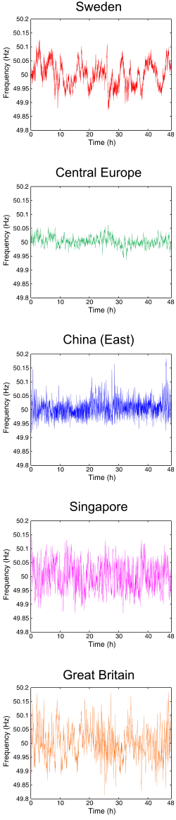 Hoe groter een elektriciteitsnet en hoe beter energiecentrales kunnen worden bestuurd, hoe stabieler de netfrequentie binnen een tolerantiebereik kan worden gehouden. In de afbeelding hiernaast wordt het verloop van de netfrequentie en de afwijking daarvan over 48 uur weergegeven voor sommige regelzones, die allemaal rond de nominale waarde van 50 Hz schommelen. In het West- en Centraal-Europese netwerksysteem (UCTE) treden de kleinste afwijkingen op. Vaak zijn echter de afgelopen jaren frequentieverschuivingen waargenomen als gevolg van handel op de beurs, wanneer centrales de nieuwe vermogenswaarde bij elke uurwisseling beëindigen en niet langer continu het uitgangsvermogen van de belasting van de besturingszone aanpassen tijdens de vervolgbewerking.