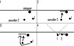 De blokkering wordt meestal door de middenspeler weggetrokken, waardoor een buitenaanvaller/passer-loper of diagonaalspeler de bal ongehinderd kan slaan. De aanvaller valt door een loopactie op een onverwachte plaats aan.