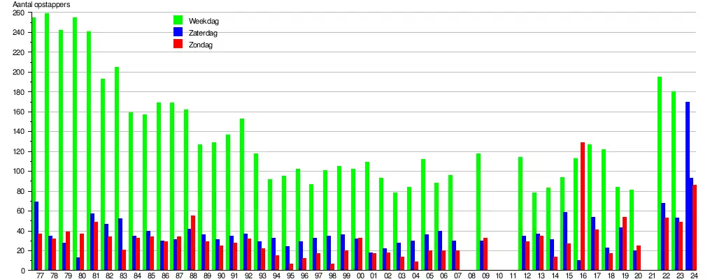 De grafiek en tabel geven het gemiddeld aantal instappende reizigers weer op een week-, zater- en zondag.[3]