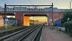 - ↑ De bron voor de gegevens zijn de jaarlijks door de NMBS in oktober uitgevoerde reizigerstellingen. Stationspersoneel en treinbegeleiders tellen dan visueel gedurende negen opeenvolgende dagen (vijf werkdagen en de twee aansluitende weekends) in alle stations en stopplaatsen het aantal instappende reizigers en dit voor alle binnenlandse treinen. De groene balk geeft het gemiddeld aantal opstappende (dus niet het aantal afstappende) reizigers weer op een weekdag (maandag, dinsdag, woensdag, donderdag en vrijdag opgeteld en gedeeld door vijf). Zaterdag wordt weergegeven door de blauwe en zondag door de rode balk. De cijfers geven een indicatie en hebben een foutenmarge, die in sommige gevallen aanzienlijk kan zijn. In 2008, 2010, 2011 en 2021 (corona) werden geen tellingen uitgevoerd. De gegevens zijn online raadpleegbaar, zoekterm Reizigerstellingen
