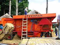 Respectievelijk Dorsmachine met Pakjespers en Dorsmachine met Binder. De persen en binders op de Steenman Dorsmachines werden niet in huis gefabriceerd. Laatstgenoemde onderdelen werden vervaardigd door de firma Claas en de firma Raussendorf uit Duitsland.