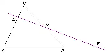 Het teken van de linkerkant van de vergelijking van de stelling is negatief: Lijn DEF snijdt de zijden een even aantal keren: