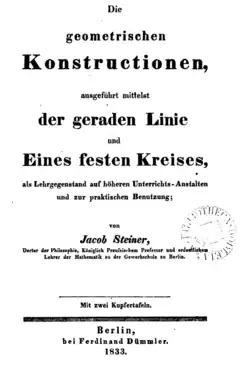 - ↑ Jacob Steiner (1833): Die geometrischen Konstructionen, ausgeführt mittelst der geraden Linie und eines festen Kreises, als Lehrgegenstand auf höheren Unterrichts-Anstalten und zur praktischen Benutzung. Berlin: Ferdinand Dümmler. Via: Google Boeken.