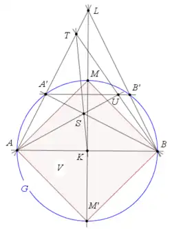 Gegeven zijn een cirkel G met middelpunt K. Te construeren: een vierkant, alleen met ongemerkte liniaal.