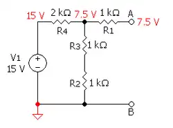 wordt hierbij niet meegenomen omdat over en de 'open-klem' spanning wordt uitgerekend, waardoor er geen stroom door de weerstand gaat. Ook is er geen belasting aangesloten, dus kan er geen stroom vloeien en dus kan er ook geen spanning worden opgebouwd over .