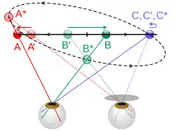 De horizontale afstand van ca 6,5 cm tussen de twee ogen zorgt er voor dat punten in de ruimte die op verschillende dieptes ten opzichte van het fixatiepunt liggen, een horizontaal richtingsverschil hebben. Dit verschil wordt horizontale dispariteit genoemd en uitgedrukt als het verschil tussen de hoeken α en β in de figuur. Naast horizontale dispariteit bestaat er ook verticale dispariteit. Met deze term wordt aangegeven dat de ogen verticaal niet zijn uitgelijnd bijvoorbeeld doordat het hoofd niet precies verticaal staat. Dit laatste wordt meestal gedeeltelijk of geheel gecorrigeerd met automatisch uitgevoerde oogbewegingen . Verticale dispariteiten kunnen in sommige gevallen ook een dieptegevoel oproepen.[16]