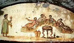 De halfronde eetbanken zijn in de oudheid op verschillende manieren afgebeeld, bijvoorbeeld op fresco's in catacomben. Ze zijn ook te vinden op laat-Romeinse eetgerei, zoals op een grote zilveren schaal uit de Seusoschat.