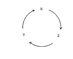 Een cykel verschilt van een verzameling doordat de volgorde van de elementen erin wel van belang is (waarbij men zich moet voorstellen dat de elementen in een kring zijn geplaatst). In de figuur hiernaast is (XZY) een cykel; (ZYX) en (YXZ) zijn dezelfde cykel, maar (XYZ, (YZX) en (ZXY) vormen een andere cykel. Drie elementen kunnen dus op twee manieren een cykel vormen; twee elementen of één element slechts op 1 manier.