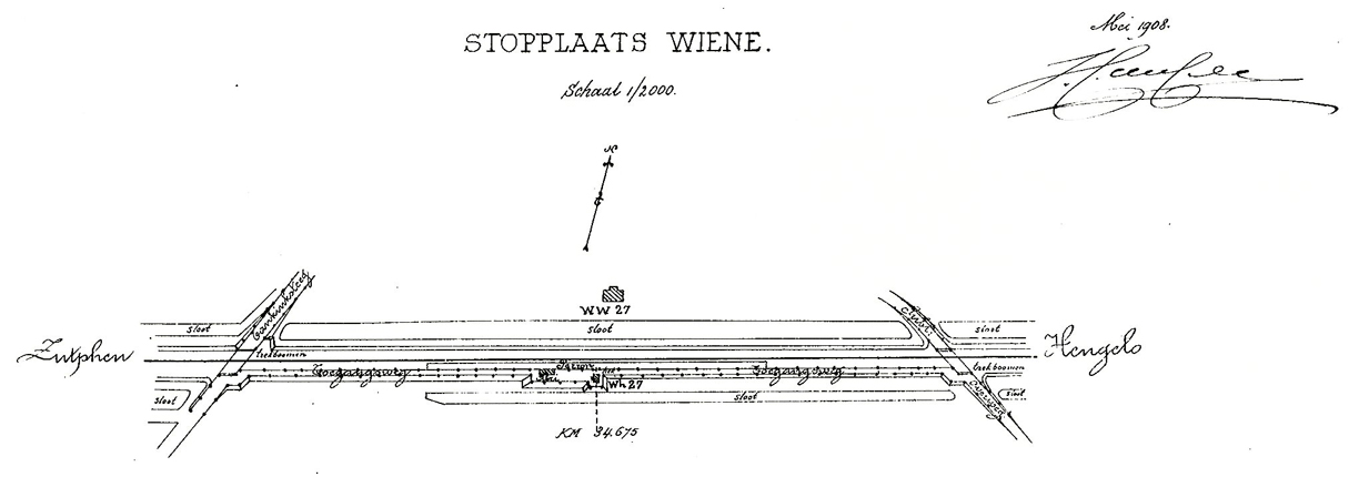 De aanleg van de zijtak van het Twentekanaal naar Almelo had tot gevolg dat de spoorlijn vanaf 1935 over de spoorbrug bij Wiene werd geleid. Op de locatie van stopplaats Wiene ligt thans het talud voor die brug.[3] De overwegen op de emplacementstekening zijn verdwenen; de wachterswoning is behouden.