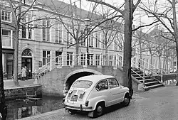 Gezicht op de gebouwen van de Koninklijke Akademie, circa 1859, met het pand Oude Delft 89 links. | ||||