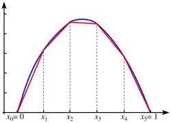 Een gegeven kromme kan men over een zeker interval door een stuksgewijs lineaire functie benaderen, die een aantal opeenvolgende punten van de kromme verbindt met lijnstukken. Hiervan wordt gebruik gemaakt door de integraal van de kromme over dat interval met de trapeziumregel snel in benadering te berekenen, door de oppervlakten van de trapeziums onder de stuksgewijs lineaire functie op te tellen.