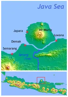 Demak in de tijd dat de vulkaan Muria en Java door water gescheiden waren. De straat van Muria is in de 18e eeuw verzand.