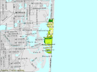 De onderstaande figuur toont nabijgelegen plaatsen in een straal van 8 km rond Sunny Isles Beach.