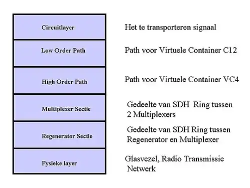 Op de onderste laag vinden we het fysieke medium, dat meestal een glasvezel zal zijn. Hierboven bevinden zich de al eerder besproken regeneratorsectie en de multiplexersectie. Deze worden samengevoegd worden dat in de Sectionlayer. De glasvezellaag verbindt twee regeneratoren met elkaar.