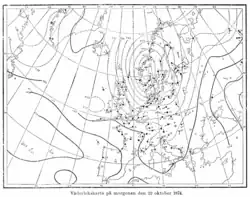 - Voorbeeld van een synoptische weerkaart. Door op een pijltje onderaan de kaart te klikken worden prognosekaarten voor de komende dagen verkregen. Tweemaal per dag worden de kaarten vernieuwd.