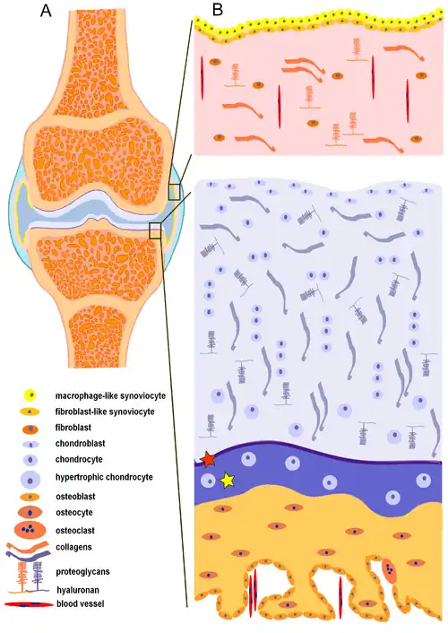 Synoviale hyperplasie (een toename van het aantal cellen) is een typisch kenmerk van de auto-immuunziekte reumatoïde artritis (RA). Tijdens de progressie van deze ziekte wordt het synoviale membraan een plaats waar voortdurend ontstekingsprocessen plaatsvinden, die uiteindelijk kunnen leiden tot kraakbeenschade en gewrichtsdestructie en -misvorming. Door de veranderingen in proliferatieve en apoptotische processen neemt het totale aantal cellen in het synoviale membraan toe, en neemt ook het aantal synoviocyten aanzienlijk toe. Deze cellen creëren, samen met andere immuuncellen zoals macrofagen, lymfocyten, neutrofiele granulocyten, mestcellen, dendritische cellen en bloedplaatjes, een ontstekingsomgeving in het synoviale membraan, trekken meer immuuncellen naar de beschadigde plaats en dragen zo bij aan de gewrichtsdestructie.[2][3][4]