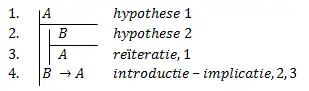 Er bestaat in deze stelling één premisse (nl. ), en deze wordt vanzelfsprekend als eerste hypothese gebruikt. Het enige wat vervolgens moet gebeuren, is onder deze aanname aantonen dat . Daartoe wordt in regel 2 een nieuwe hypothese aangenomen. Omdat de hypothese uit 1 nog steeds actief is, kan daarop reïteratie worden toegepast, zoals gedaan is in regel 3. Uit de regels 2 en 3 valt vervolgens de implicatie te introduceren, zoals in regel 4 is gedaan. Daarmee is het bewijs van voltooid.