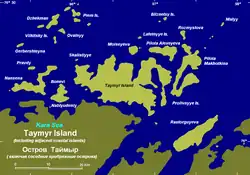 Locatie van het eiland Tajmyr in de Karazee, ten zuiden van de Nordenskiöldarchipel | |